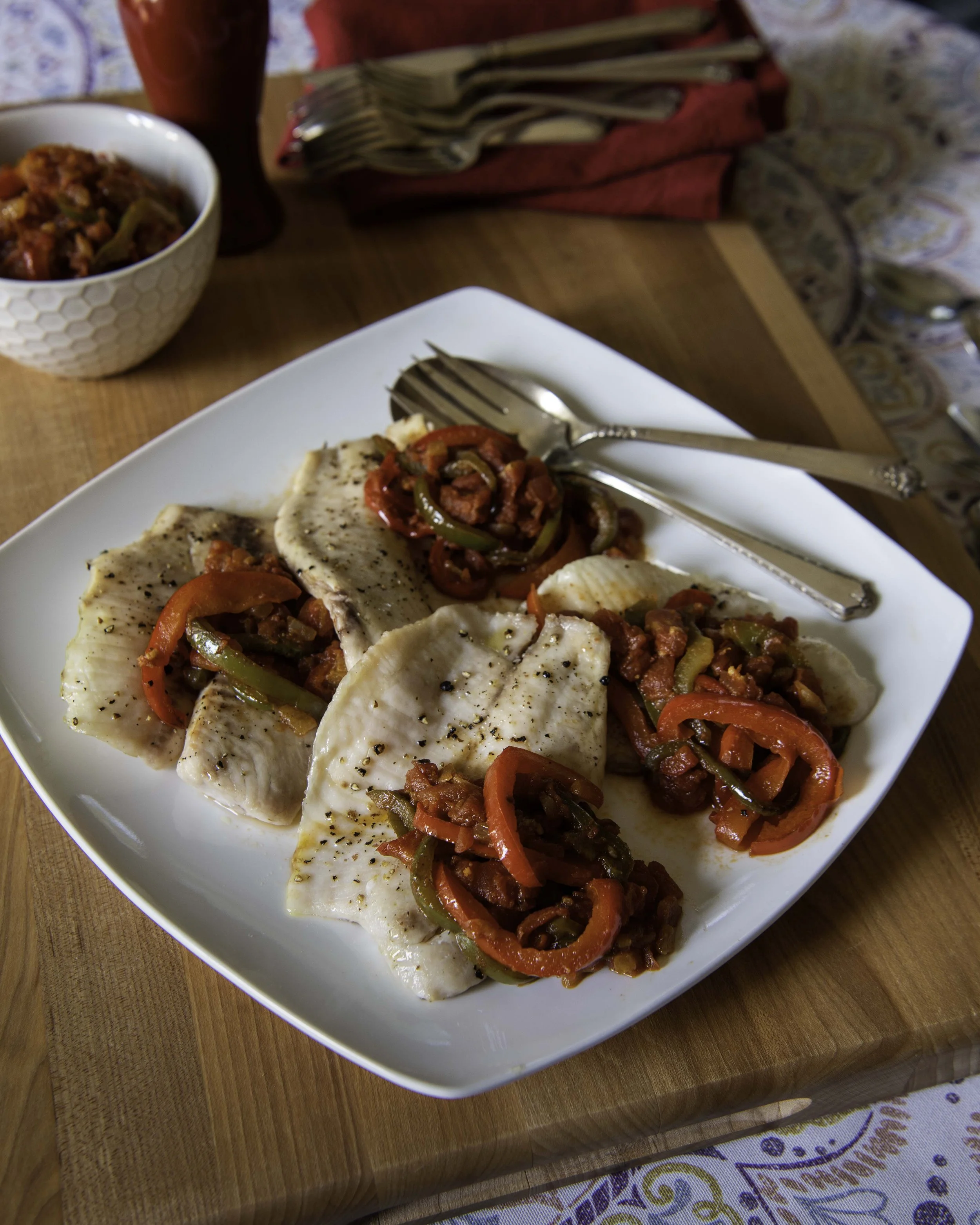 Piment d’Espelette is the classic spice for Piperade, A good substitution for Piment d’Espelette is either Aleppo Pepper or a combo of Spanish paprika and Cayenne pepper. Photo from my Everyday French Cooking cookbook.