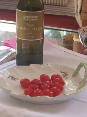 No kidding. This is what I was served in the home of a Bordeaux winemaker as an appetizer. The loveliest in-season tomatoes she had, with a nice Bordeaux blanc. Then we moved to the table for a feast.